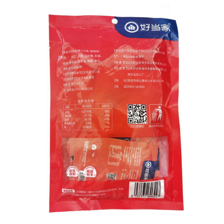 好當家軟烤三文魚以其豐富的營養成分脫穎而出。每 100 克三文魚含有高量不飽和脂肪酸,包括 EPA 與 DHA,對視力、心臟及免疫系統有益。產品提供優質蛋白質與鈣質,補充日常所需,特別適合成長中的兒童與中老年人。軟烤技術在低溫下烘烤,最大限度保留三文魚的生物活性物質,避免高溫損耗營養,同時賦予魚肉柔嫩口感與濃郁風味。相比傳統油炸零食,這款產品無添加過多油脂,健康低負擔。好當家嚴選原料,確保每一片三文魚新鮮安全,讓您在享受美味的同時,攝取深海精華。適合搭配沙拉或單獨食用,健康與美味兼得!