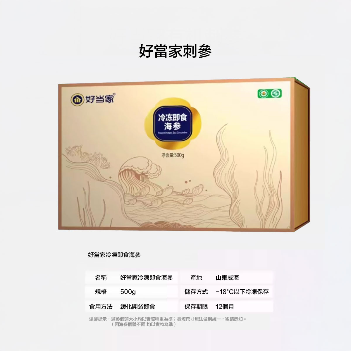 好當家冷凍即食海參 500g 使用極為簡單,只需從冷凍取出,置於室溫或溫水解凍3分鐘,即可食用,可涼拌、燉湯或直接享用,膠東風味濃郁,鮮嫩可口。金色禮盒包裝精緻大氣,500g 規格適合家庭分享或送禮,尤其在中秋、新年等節日備受青睞。消費者重視健康與便利,這款產品以有機刺參與速凍技術滿足需求,市場定位中高端,性價比高。好當家品牌信譽與天海灣牧場的天然優勢,讓您輕鬆享受滋補美味。立即購買,為家人帶來健康與幸福的海洋饋贈,3 分鐘解鎖大廚級享受!