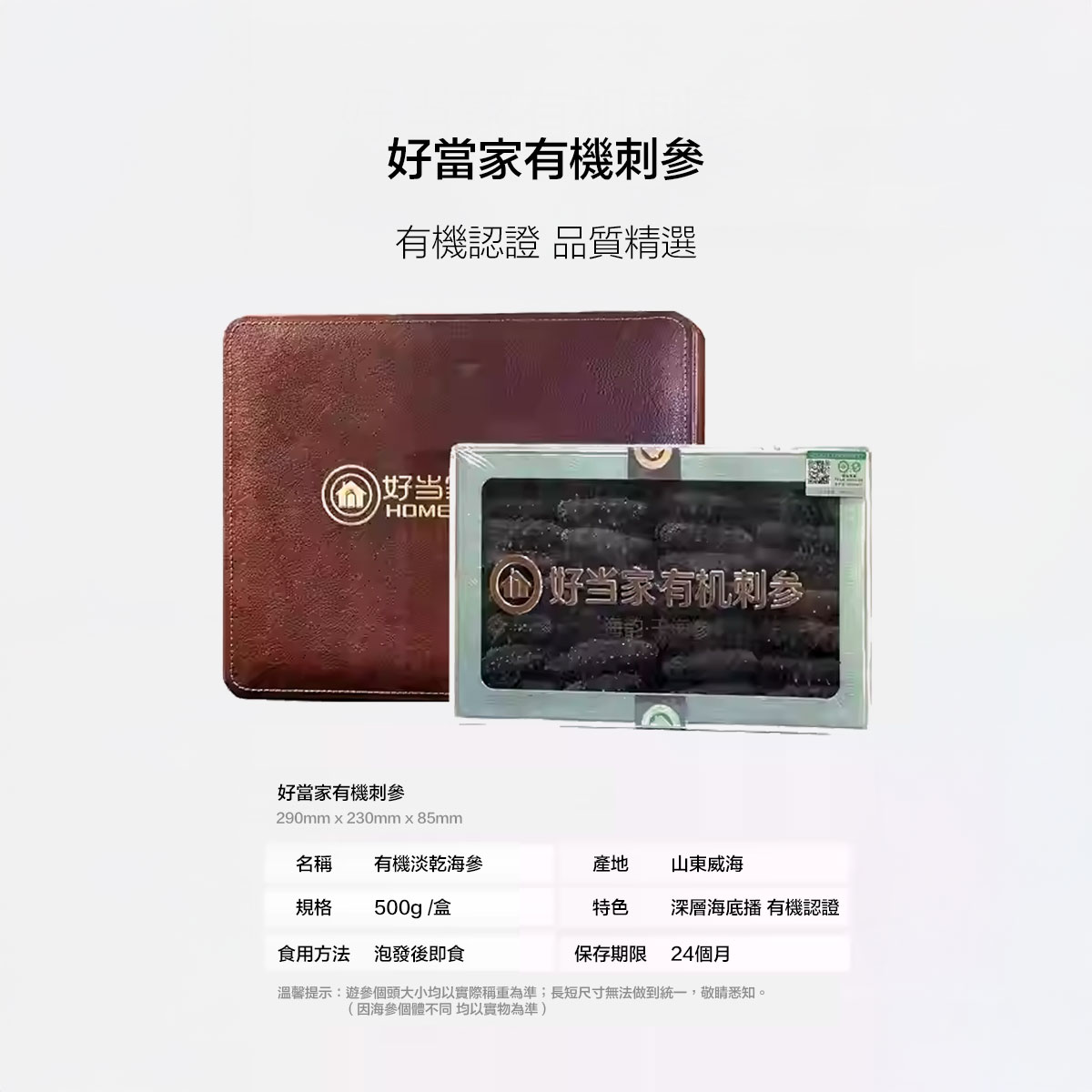 海韻乾參 500g(80-100頭)是好當家旗下的有機淡乾海參精品,源自山東威海深海底播,專為注重健康與品質的消費者打造。每盒 500g,經連續14年有機認證,無人工催熟,自然生長,確保品質如一。產品以輕奢包裝呈現,極簡主義設計融合自然與人文,燙金徽標與細緻走線展現匠心,精致皮質搭配銀灰葛布,彰顯純粹與尊貴,適合節日送禮或自用。好當家有機刺參用心呵護您的健康,肉眼可見的品質——參刺堅硬挺拔、參足密集匀稱,讓您吃得放心,買得舒心。立即選購,體驗海洋的健康饋贈!